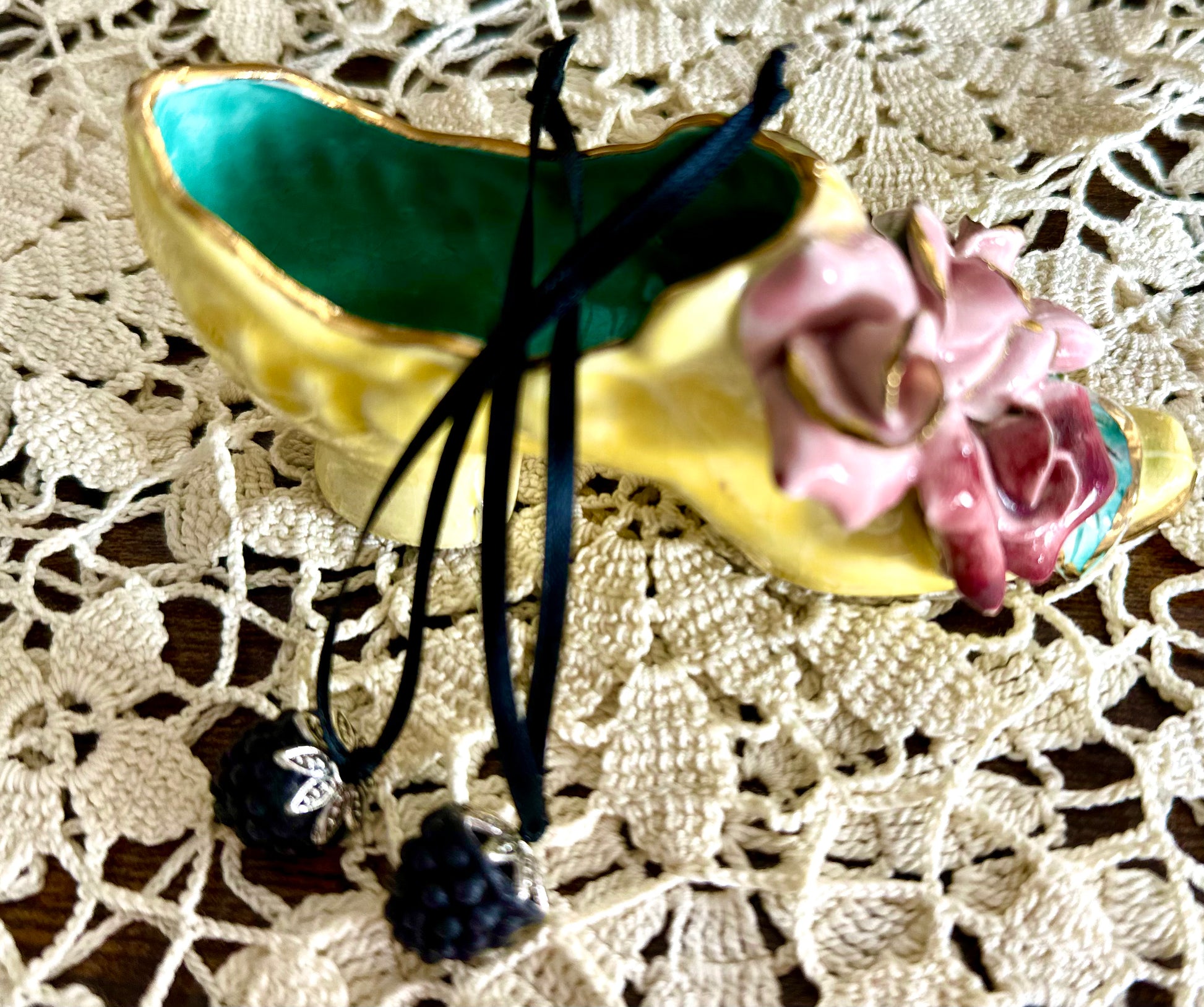 Beautiful blackberry waxer topped with metal leaf cap . A little something pretty to wax your threads or decorate your stitching box.